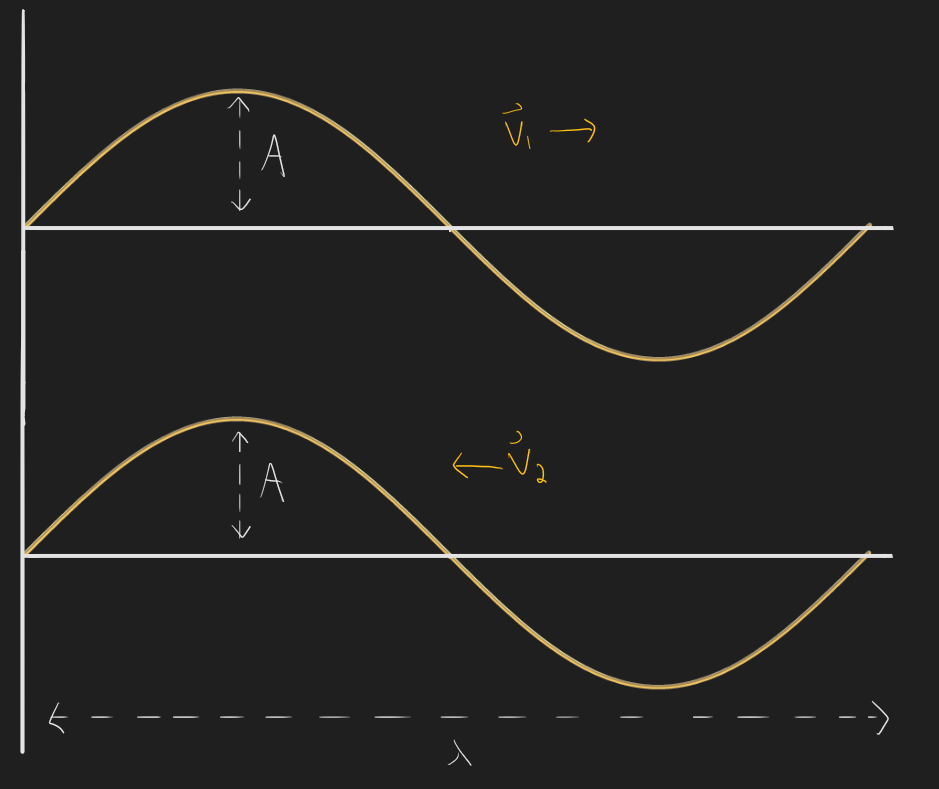 **Q14.3) Consider again the waves from Q14.2. Suppose you were to wait a length of time equal to a quarter period (t = T/4) and take another snapshot of the two waves.