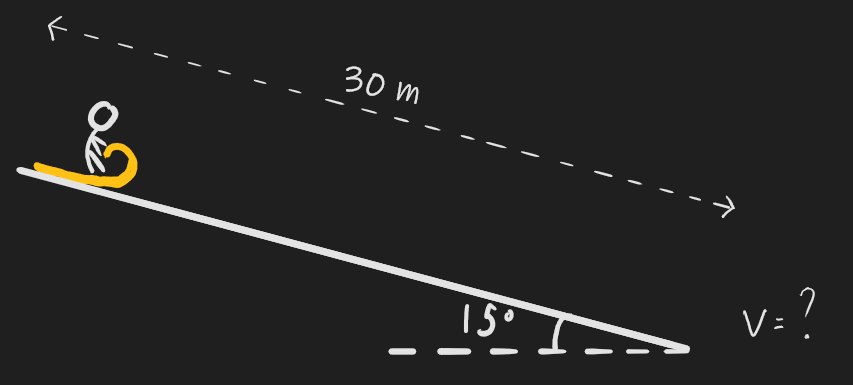 **Q4.5) Initially at rest, you toboggan down a hill inclined at an angle of 15 degrees, reaching the bottom of the hill after travelling 30m along its surface. Given that you release 320 J of thermal energy due to friction as you slide down the hill, find your speed at the bottom. Your mass is 70kg and the mass of the toboggan is 20kg.