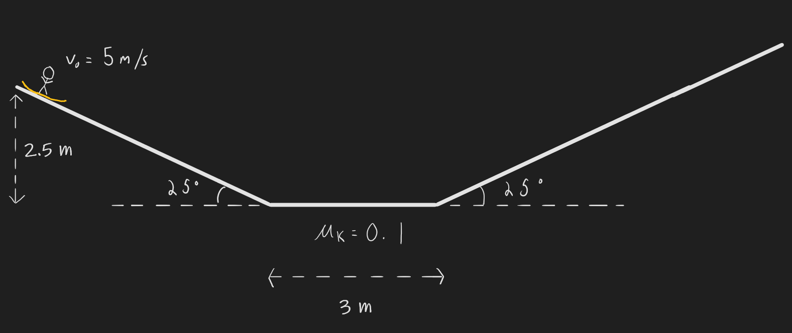***Q4.8) A snowboarder hits the ramp shown below with an initial speed of 5m/s. Given that the coefficient of friction between her board and the snow is 0.1, find the maximum vertical height that she reaches up the ramp opposite to where she started.