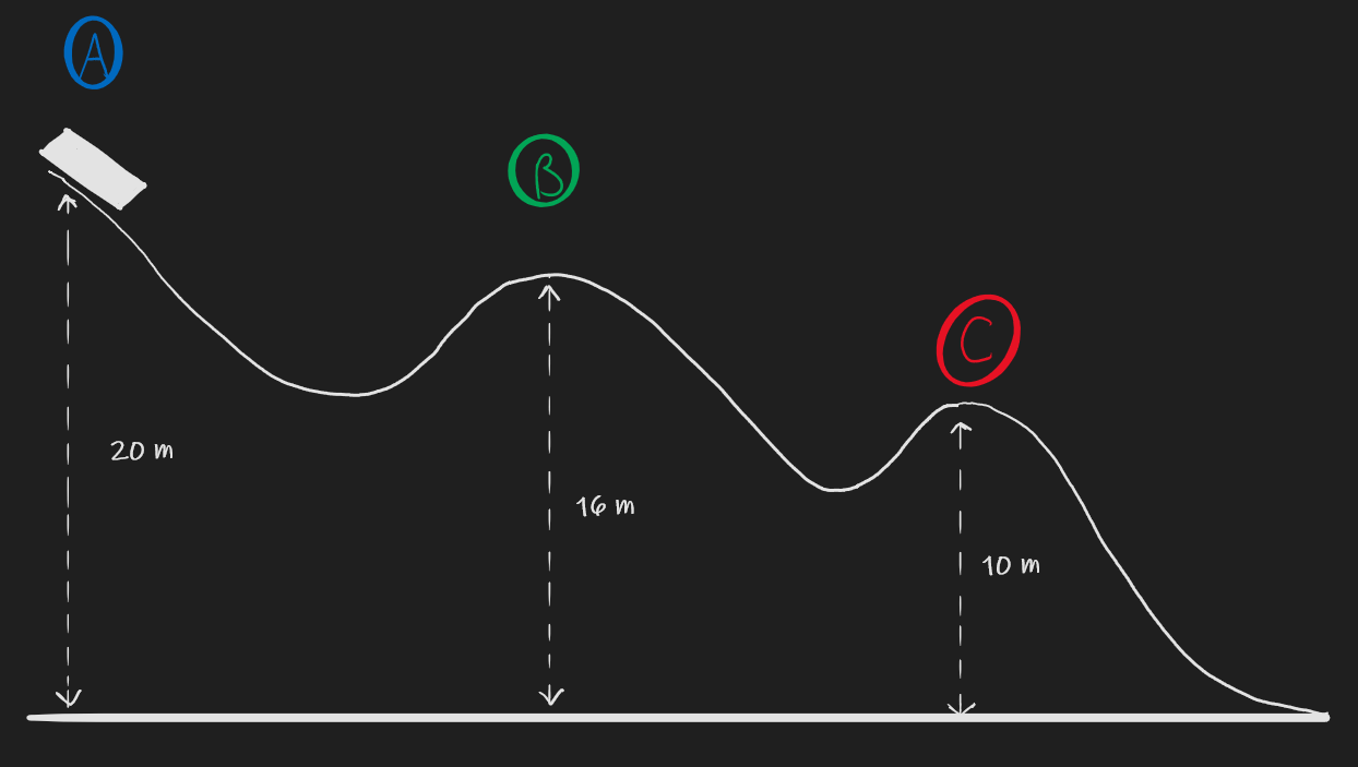 **Q4.4) A block of ice of mass 1kg is released from rest at point A on the ramp shown below. Ignore friction.