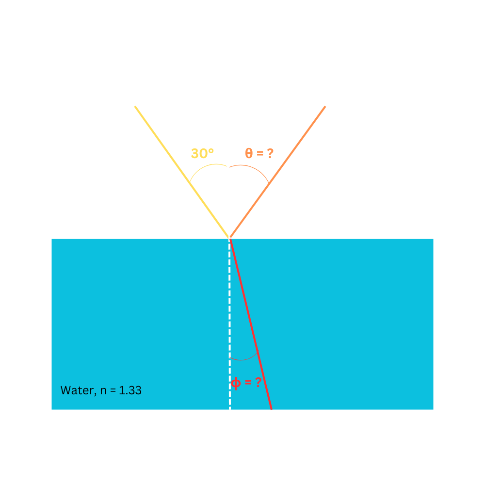 *Q52.1) A ray of light passes from air to water as shown below. Find the unknown angles θ and ϕ.