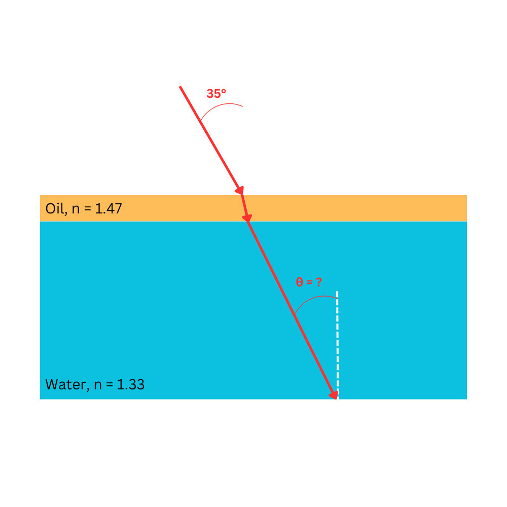 **Q52.2) A thin layer of oil floats atop some water as shown below. Find the unknown angle θ.