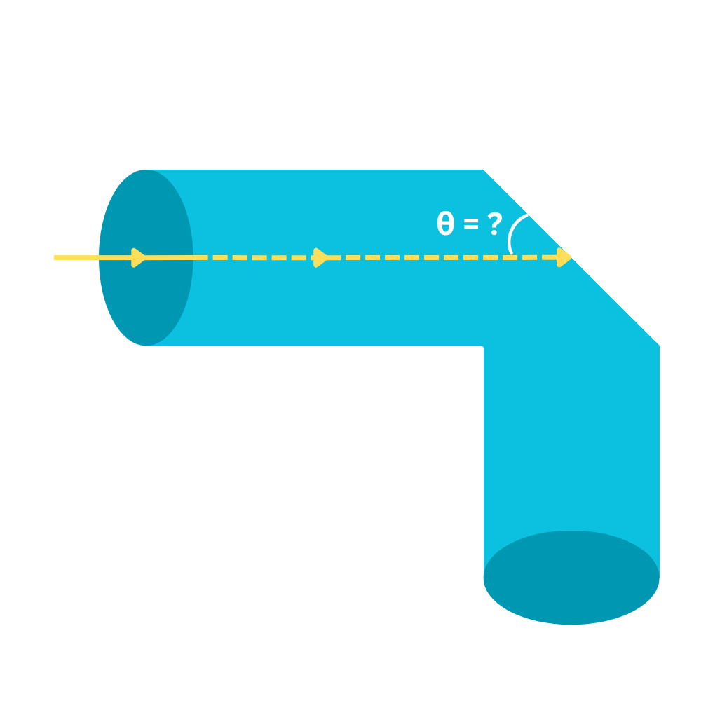 **Q52.3) A ray of light enters a glass tube with an index of refraction 1.5 as shown below. The light travels parallel to the upper part of the tube before reflecting off the face AB. Find the largest angle θ for which all the light reflects back into the tube, assuming the tube is surrounded by air.
