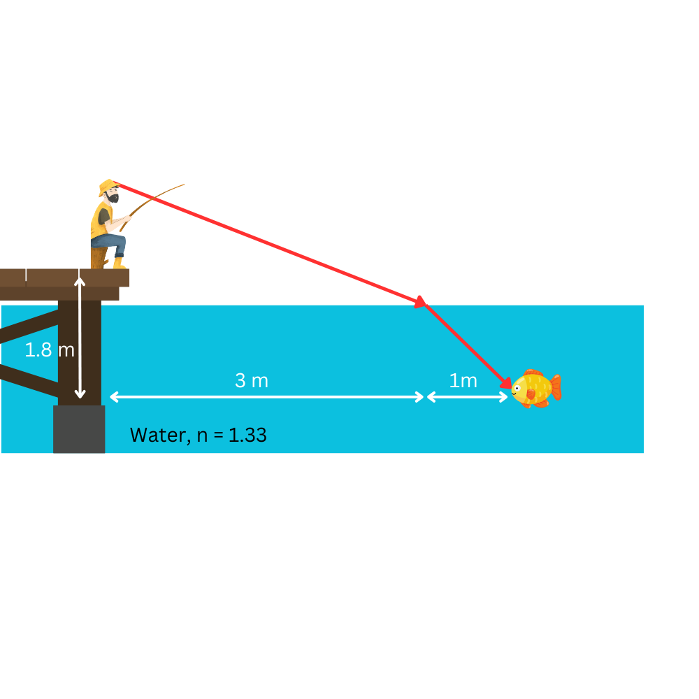 ***Q52.4) A fisherman sits on a dock as shown below. How far above the dock does the top of the fisherman’s head appear to be from the fish’s perspective? Hint: consider the ray shown in red that travels from the top of the fisherman’s head to the fish’s eye.